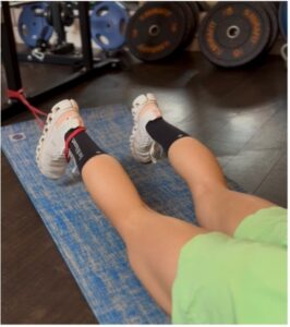 Hamstring curl. 3×10/side. Add more resistance by increasing tension on the band.